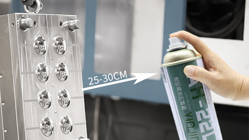 使用前必須將模具清洗並吹幹,多層次均勻噴到需處理的部件。 切勿使用火花油,白礦油,煤油作清洗。 建議使用模具清洗劑清洗。